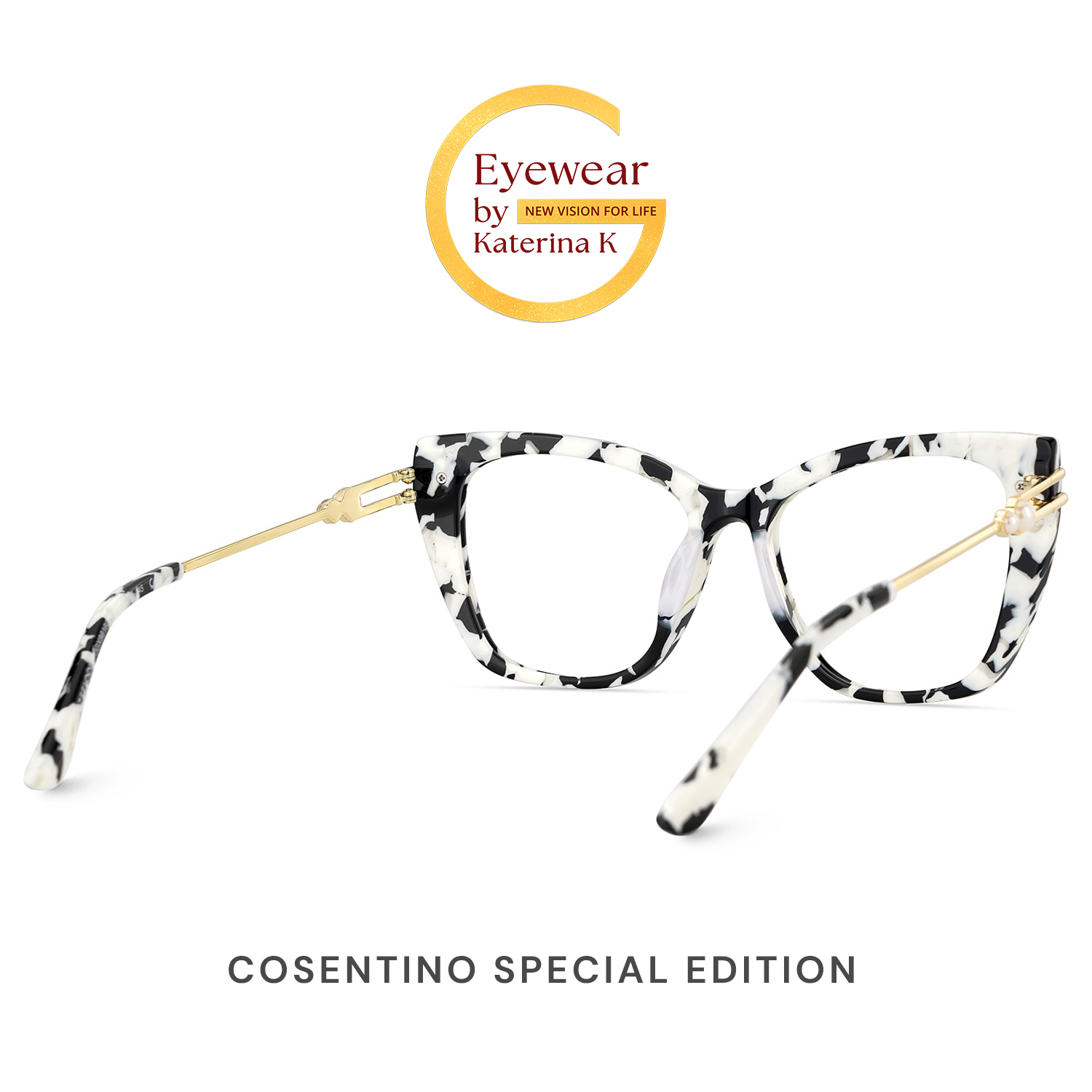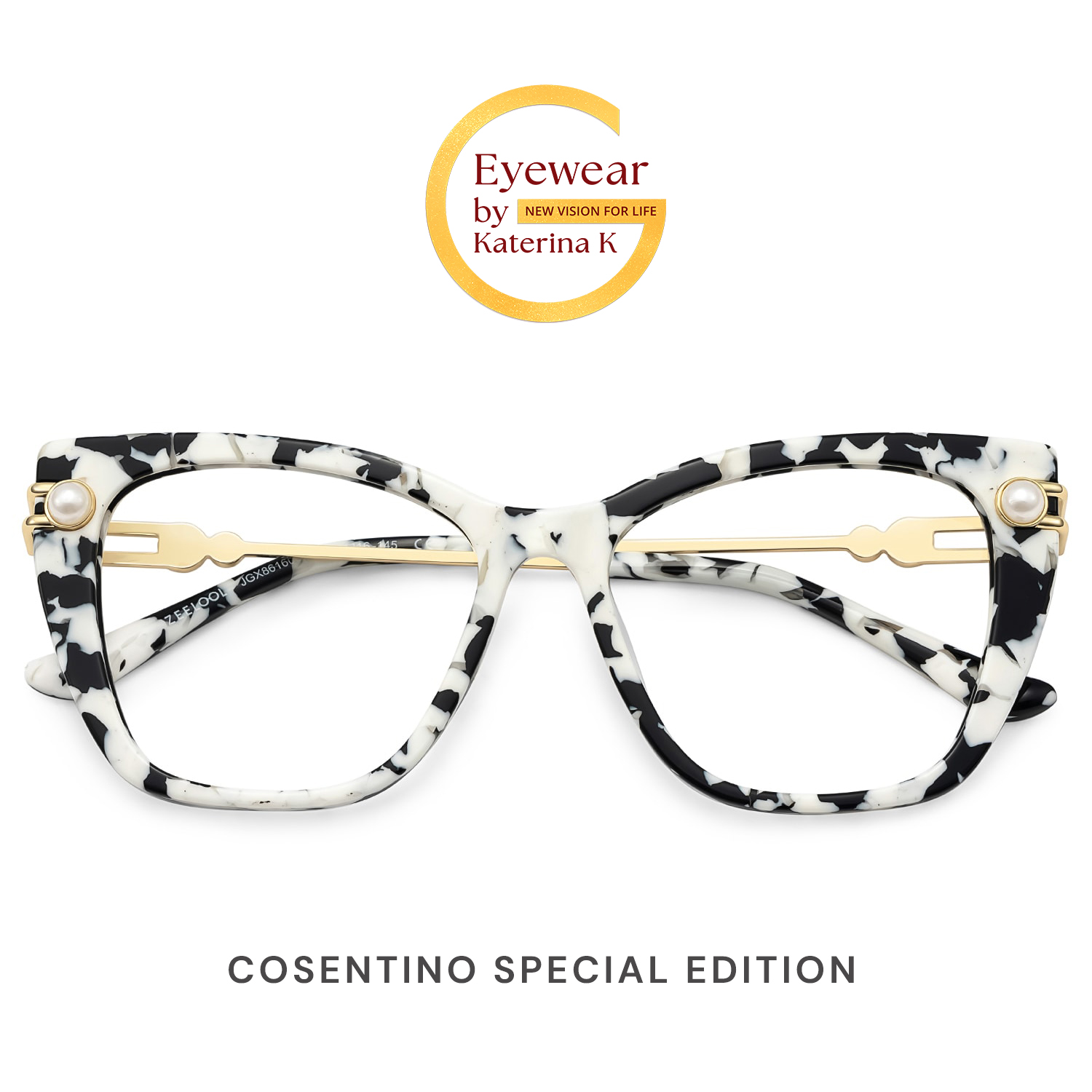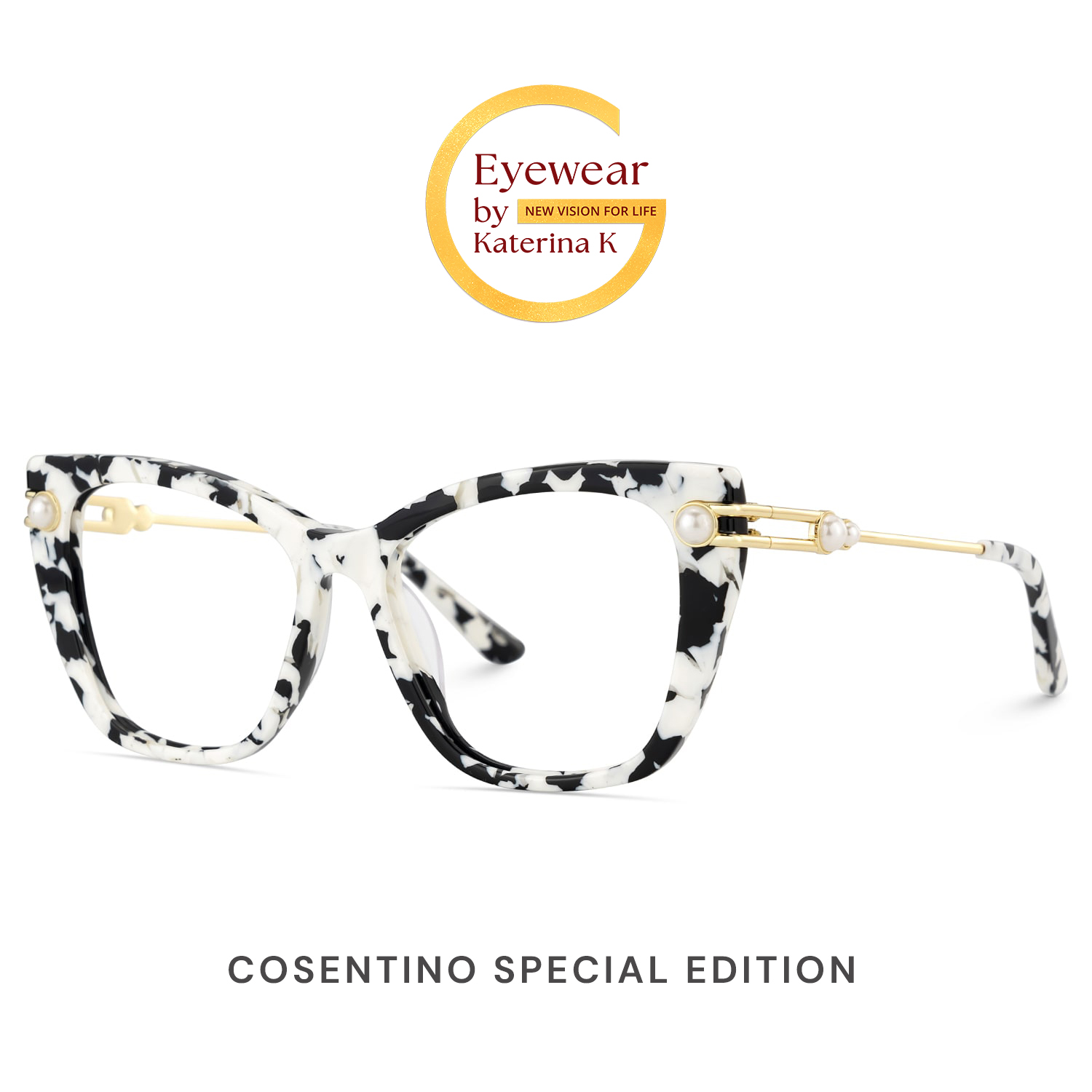 The Cosentino Special Edition captures refined glamour through a contemporary reinterpretation of the classic cat-eye silhouette. Crafted from a harmonious mix of materials, these frames balance strength with graceful design. Their unique cow-pattern finish and delicate pearl accents along the metal temples create an effortlessly chic statement piece.