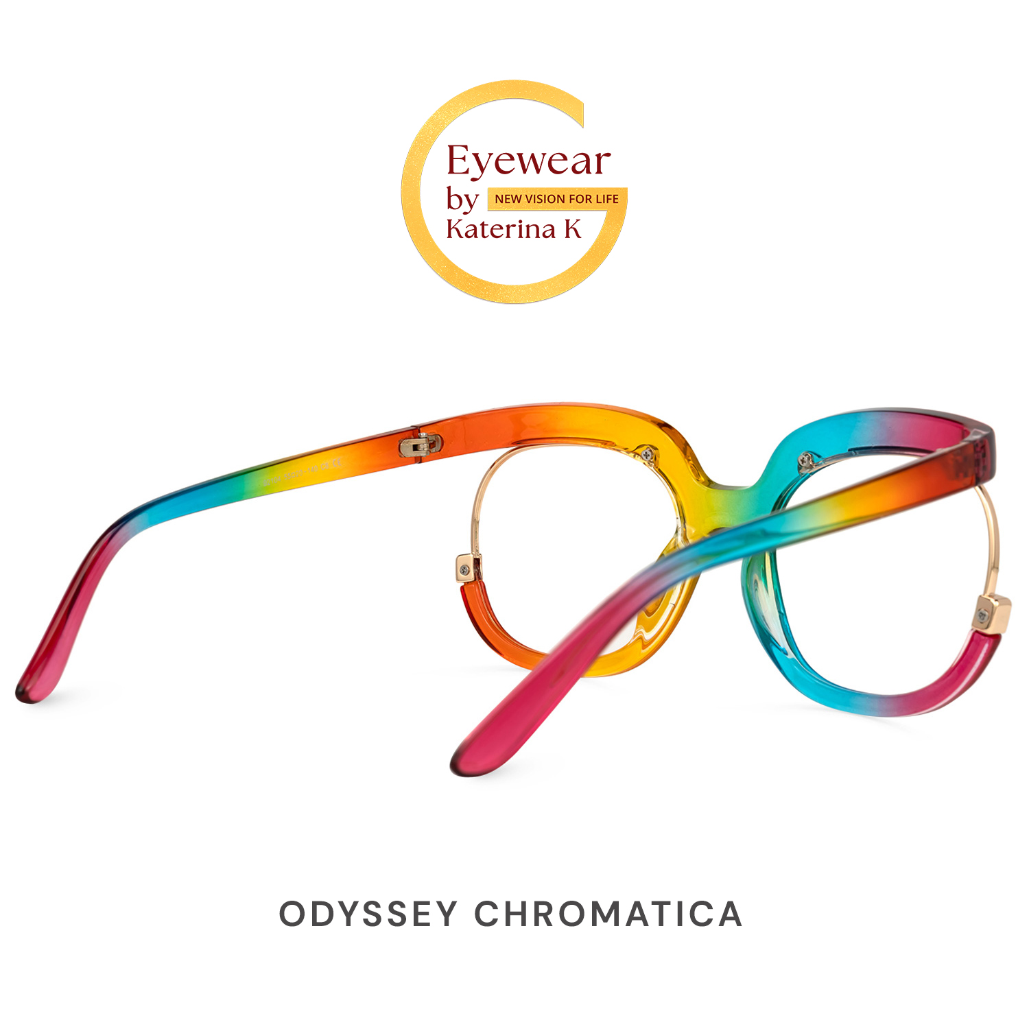 The Odyssey Chromatica Collection features a beautifully crafted oversized eyewear piece that blends style with functionality. This design showcases a unique multicolor glass that suits a range of personal tastes and preferences. The lenses can accommodate various prescription options, including anti-blue light, anti-radiation, and progressive lenses, offering reliable protection for your vision health.