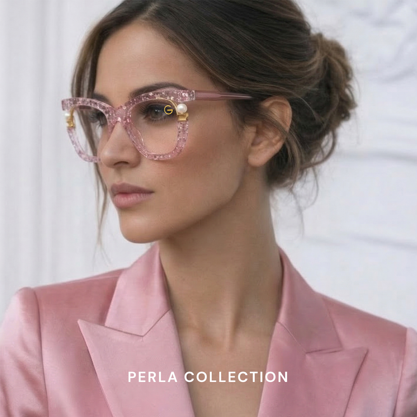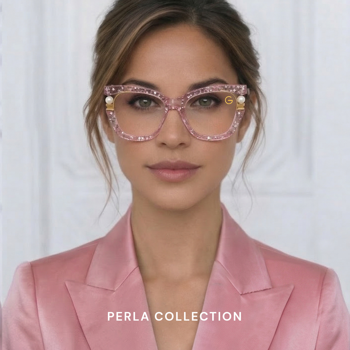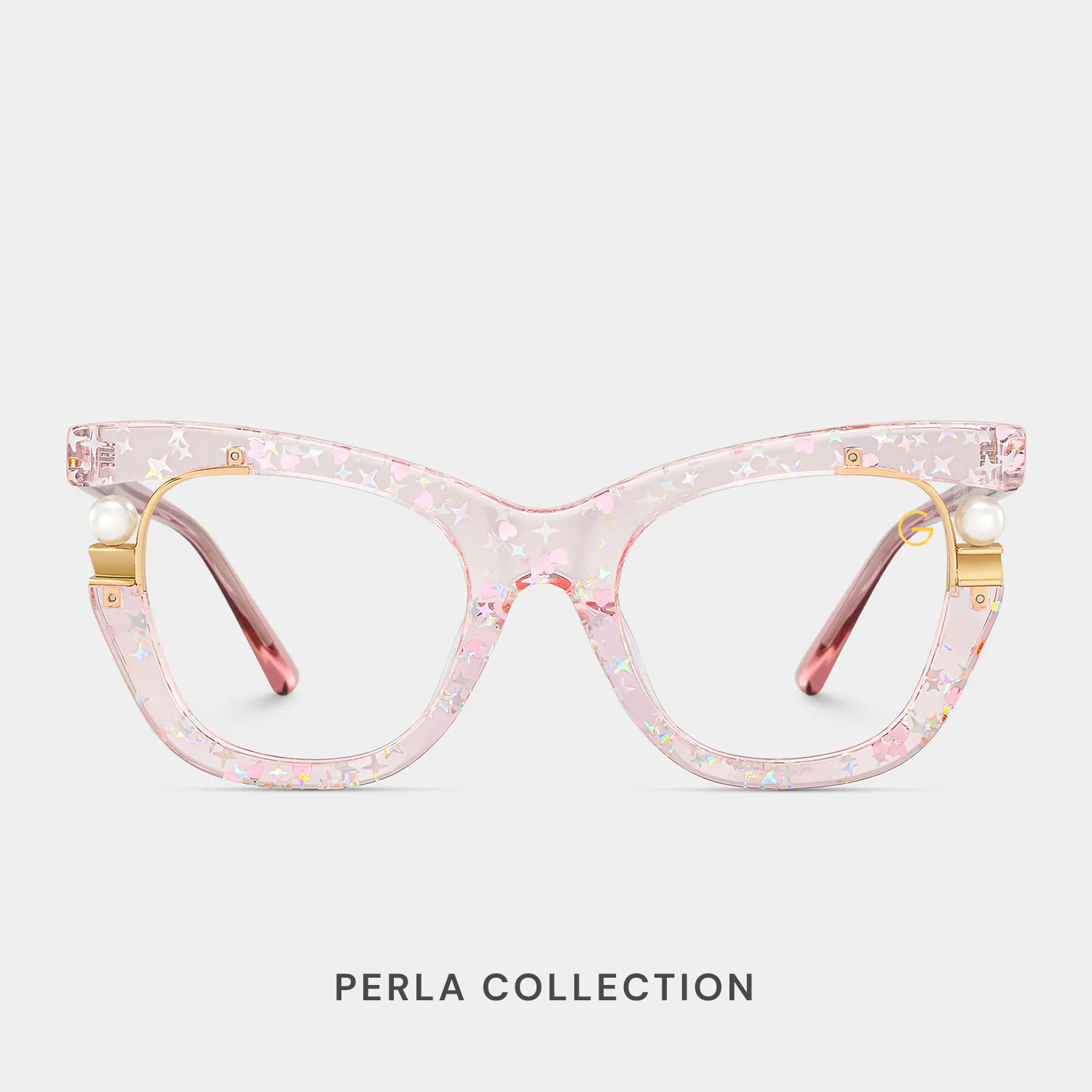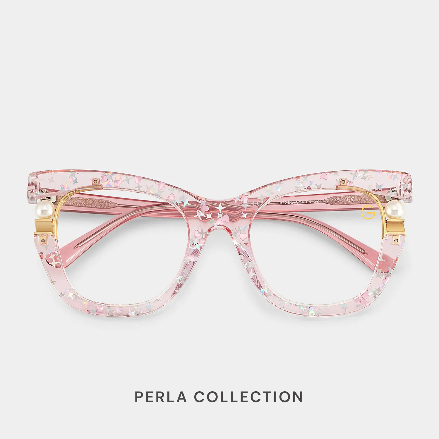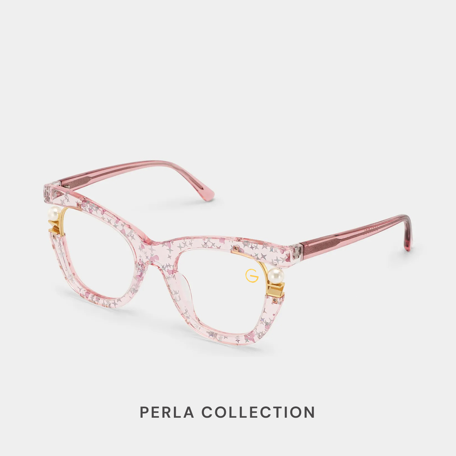 The Perla Collection by G-Eyewear features elegant cat-eye frames with a lightweight, flexible design crafted from hypoallergenic materials. Adorned with delicate pearls and sparkling star accents on soft transparent pink frames, they capture youthful charm and graceful style. Designed to suit all face shapes, these glasses celebrate individuality, creativity, and modern elegance.